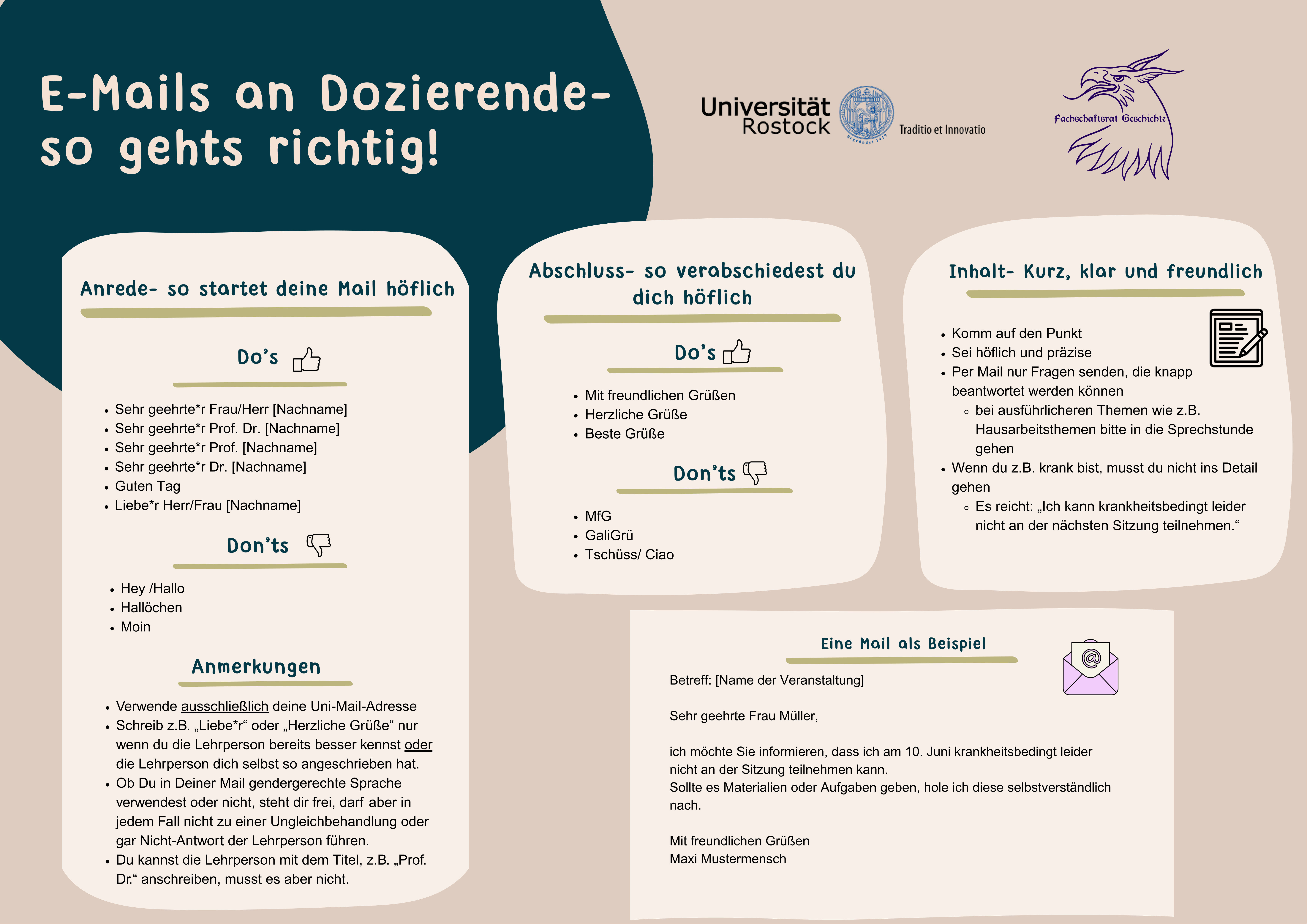 Wir empfehlen dir als Studienanfänger*in dringend, an der Einführungswoche teilzunehmen. In allgemeinen und studiengangsbezogenen Veranstaltungen werden wichtige Hinweise gegeben, um dir den Studienbeginn zu erleichtern. Das Historische Institut bietet in jedem Jahr eine eigene Einführungsveranstaltung an. Unter anderem werden in dieser notwendige Informationen zu den Latinumskursen gegeben sowie die Einschreibung in die Grundkurse und Tutorien vorgenommen. Auch die Fachschaftsräte der verschiedenen Studiengänge bieten meist ein umfangreiches Programm an (z.B. Stundenplanhilfe). Das Programm zur Einführungswoche wird unmittelbar vor Beginn des neuen Semesters auf der Internetseite der Universität Rostock veröffentlicht.